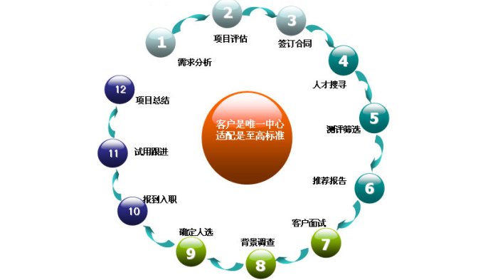 岗位分析 发布招聘 收集简历 人数匹配 电话预约 组织面试 确定方向 职前培训 办理入职 入职保障